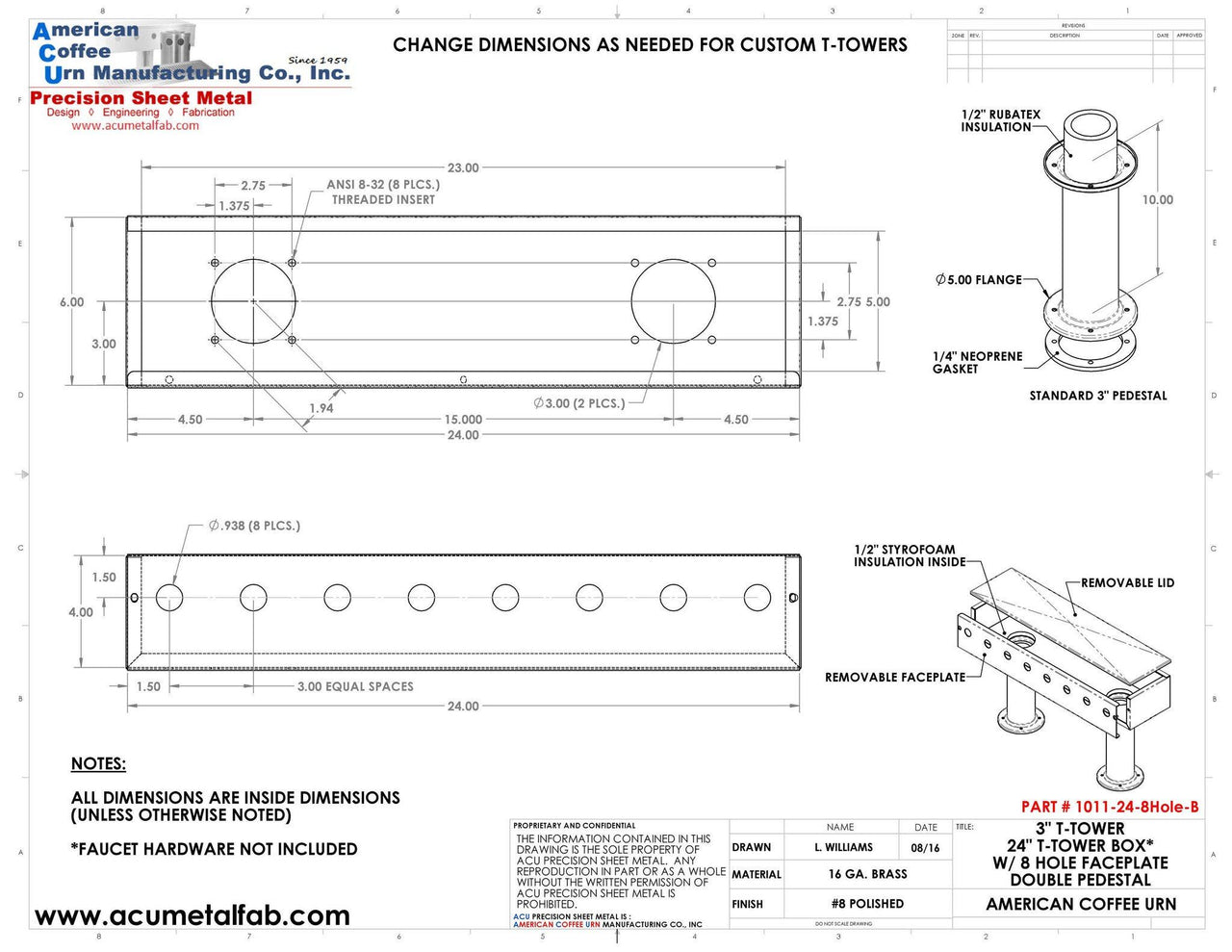 T-Towers are designed to mount to one or more pedestals. Our Pedestals are 10" tall. T-Towers are made of 16 ga. Brass in # 8 Mirror Finish. The removable faceplate is used to attach beer lines as easily as possible. T-Towers come with Styrofoam and Rubatex insulation and Neoprene gaskets to aid in keeping the product cold. Pedestals come in 3" diameter. The flanges on the pedestals are welded to the tubing thus eliminating dirt catches and producing a smooth seamless joint. The flanges are press formed from a single piece of material and have 4 countersunk holes for mounting. We supply the metal housing for that the beer lines go into. We do not include or sell taps or beer lines. We supply the suppliers of the Beer and Restaurant Industry with the finest stainless steel metal products since 1959.