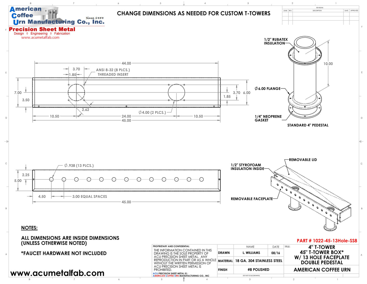 T-Towers are designed to mount to one or more pedestals. Our Pedestals are 10" tall. T-Towers are made of 18 GA. Stainless Steel in #8 Mirror Finish. The removable faceplate is used to attach beer lines as easily as possible. T-Towers come with Styrofoam and Rubatex insulation and Neoprene gaskets to aid in keeping the product cold. Pedestals come in 4" diameter. The flanges on the pedestals are welded to the tubing thus eliminating dirt catches and producing a smooth seamless joint. The flanges are press formed from a single piece of material and have 4 countersunk holes for mounting. We supply the metal housing for that the beer lines go into. We do not include or sell taps or beer lines. We supply the suppliers of the Beer and Restaurant Industry with the finest stainless steel metal products since 1959.