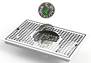 The Flush Mount with Drain and Rinser Hole style drip tray is designed to mount flush to any surface with a relieved opening. Flush Mounts are made of 18 gauge Stainless Steel in #8 Mirror finish. The corners and seams are welded and ground to either a brushed or polished high finish. All exposed edges are deburred smooth for safety and appearances. Each tray is available with a standard 18 gauge perforated screen. Drains are 1 1/2" long, 1/2" NPT Pipe Thread. This Flush Mount also has an angled bottom for drainage.